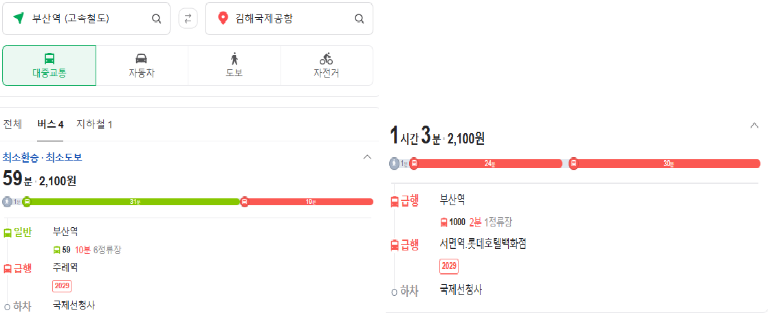 네이버 지도에서 방법을 찾아보고, 구글 지도에서 방법을 찾아봤을때 결과가 비슷하게 나오는 것을 발견 할 수 있습니다. 김해공항 리무진이 사라진 지금, 가장 적합한 방법은 구표역에서 김해공항으로 가는 버스를 타는 것이라는 생각이 듭니다.