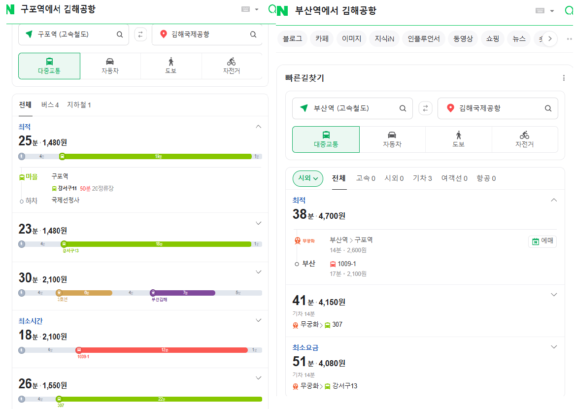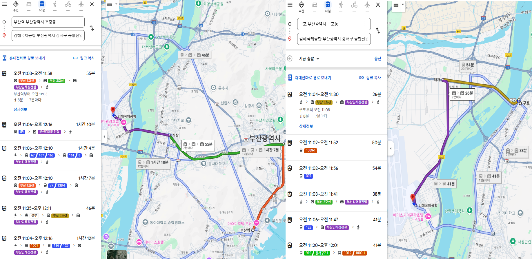 구포역에서 출발하는 대중교통이 더욱 빠르게 김해공항에 도탁하는 것을 볼 수 있습니다. 네이버 지도 뿐만 아니라 구글 지도를 비교해도 비슷한 결과를 볼 수 있습니다. 아래의 구글 지도를 함께 비교해보겠습니다. 왼쪽이 부산역에서 김해공항 가는 방법이며, 오른쪽이 구포역에서 김해공항으로 가는 방법입니다. 네이버 지도와 비슷한 결과값을 볼 수 있습니다.