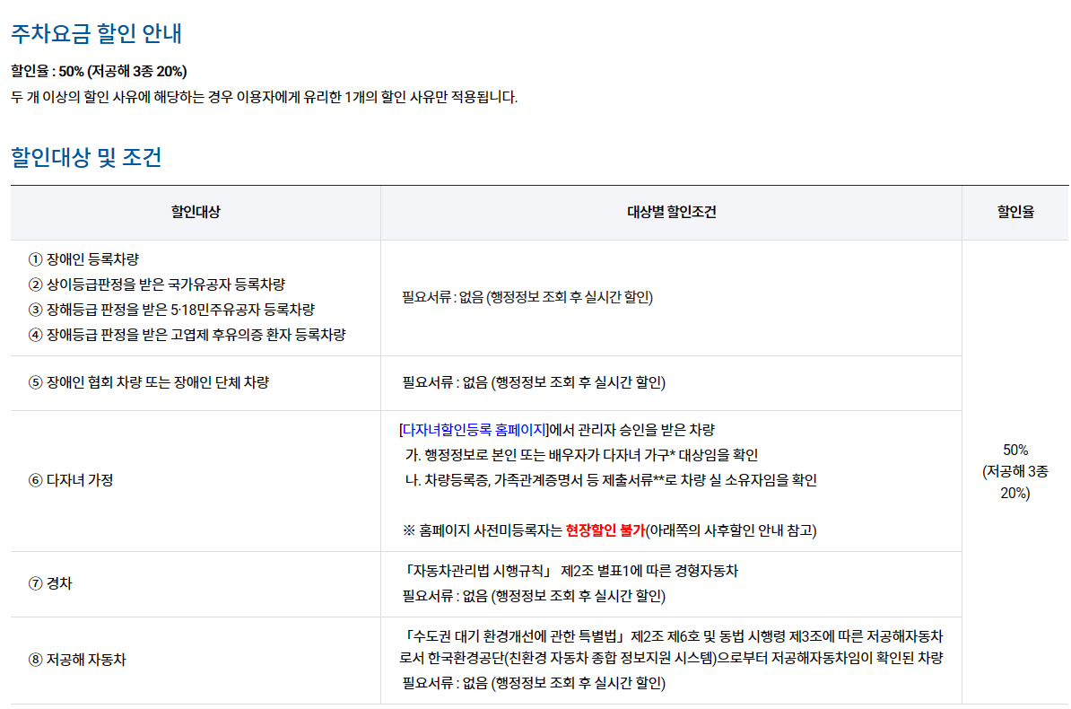 두번째로 공항 주차 요금 할인 받는 방법인데요, 아래와 같은 항목에 해당되시면 50%를 할인 받으실 수 있으니까 꼼꼼하게 읽어보시고 서류를 챙겨가시는게 좋겠죠?
