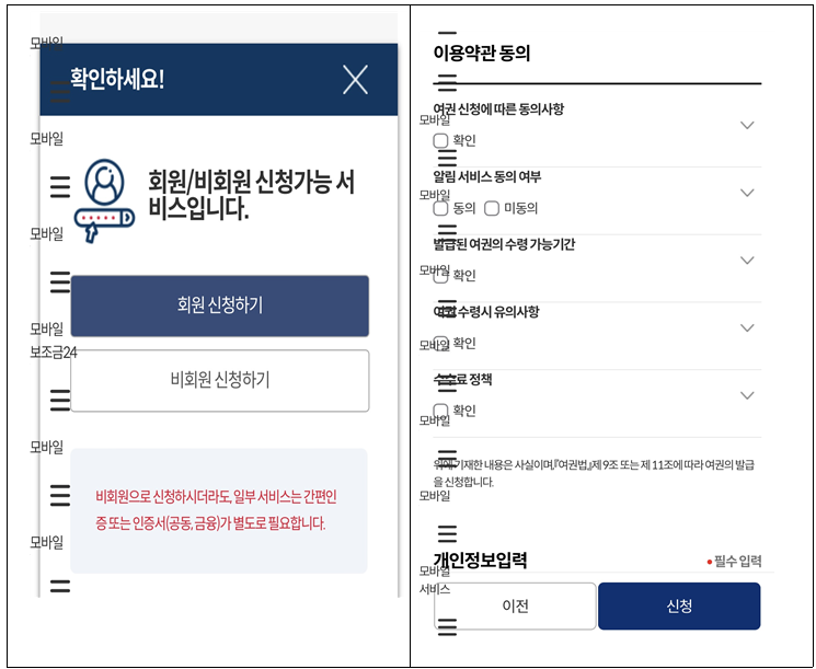 그러면 회원/비회원 신청하기가 나오는데 회원가입을 하셨다면 회원으로 클릭하시고, 회원가입이 귀찮으시면 각종 인증서를 통해 비회원도 신청할 수 있습니다. 그렇게 회원/비회원 신청하기를 누르고 들어가면 각종 이용약관이 뜰텐데 모두 동의하고 아래쪽 개인 정보 입력란을 채워줍니다.(사진에는 보이지 않습니다.)