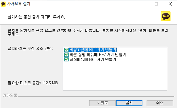 4. 카카오톡이 설치되는 동안 설치 구성 요소를 선택하게 됩니다. 필요한 요소만 체크를 남겨두고 필요없는 나머지는 체크를 눌러서 초록 체크를 없애주세요.(저의 경우 '바탕화면에 바로가기 만들기'만 남겨두고 다른건 귀찮아서 지우는 편입니다.) 그리고 '설치'를 눌러주세요.