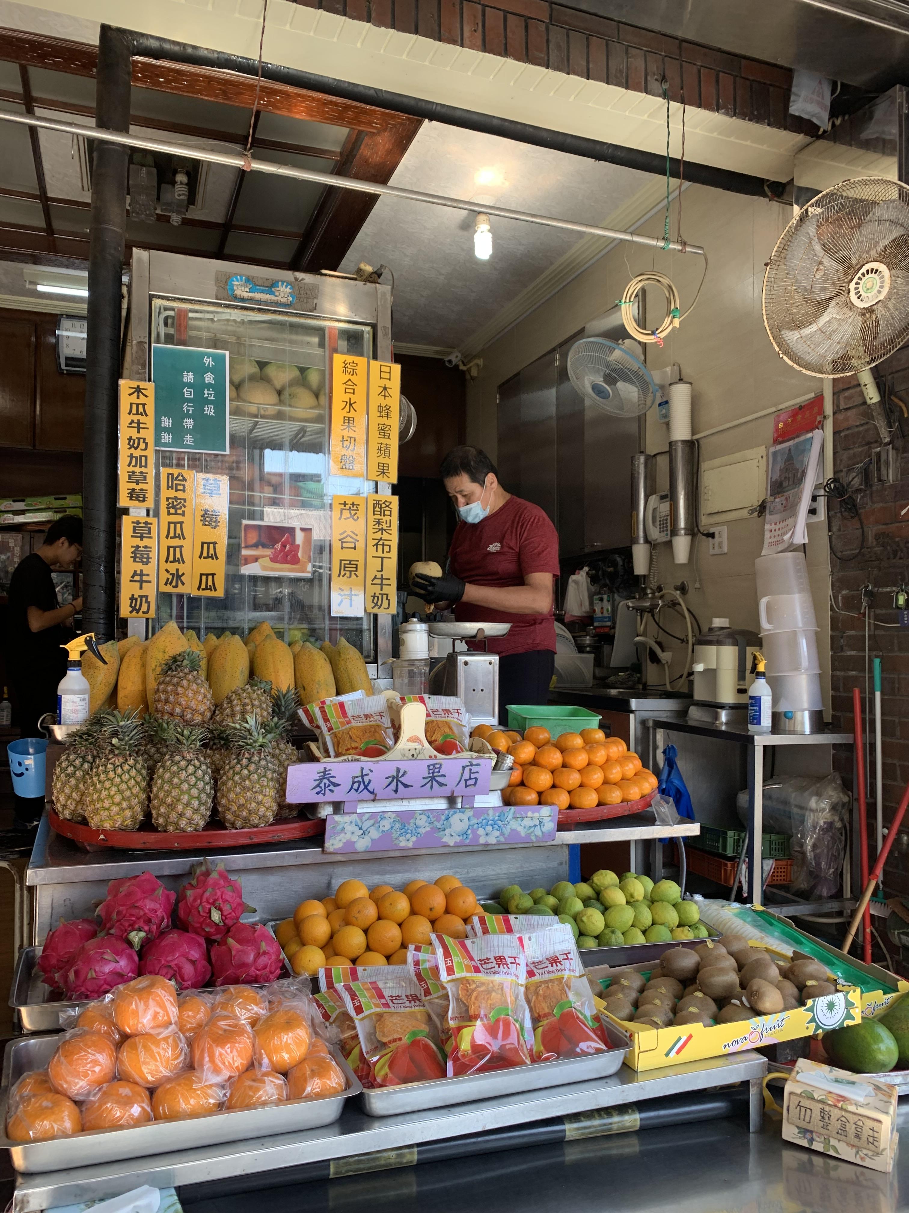 태성수과점에 가기 전에 웨이팅이 기본이라는 얘기를 들어서 살짝 쫄았는데, 제가 갔을때 웨이팅은 없었어요. 하지만 제가 착석 하고 나서 계속 사람들이 들어왔답니다. 평소에도 그만큼 인기 있다는 증거겠죠? 그리고 처음 보면 그냥 과일가게인가? 싶은 생각이 들지만 들어가면 빙수를 시킬 수 있습니다. !! 주변에 줄 서 있는 사람들로 인해 길이 좀 복잡했지만, 오히려 그 기분 좋은 소란스러움이 이곳의 특색처럼 느껴졌고 또 대만 특유의 느낌을 제대로 느낄 수 있어서 좋았습니다.