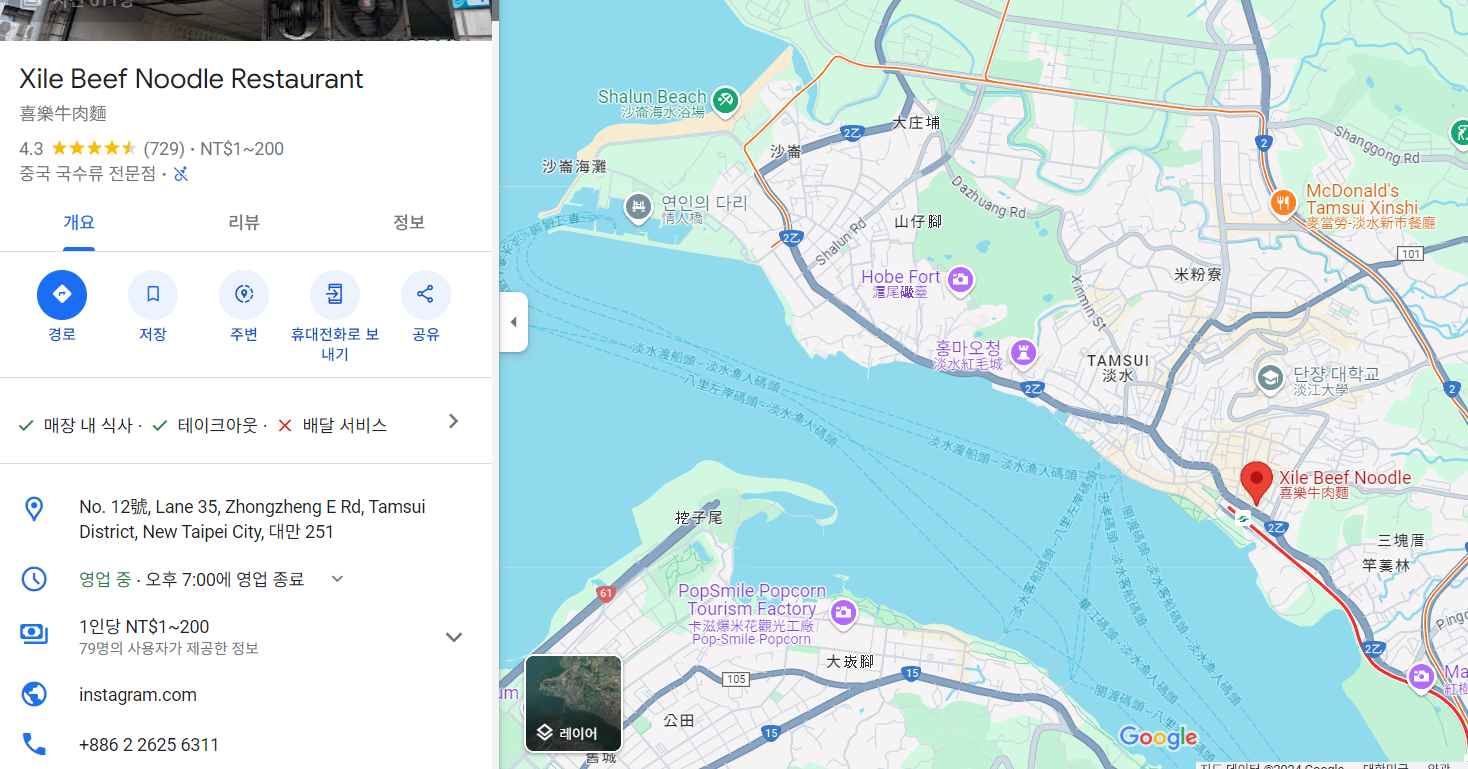 타이베이 우육면 喜樂牛肉麵은 매력적인 장소로 손꼽히는 단수이에 위치하고 있습니다. 타이베이 가시면 단수이는 노을 구경 하시러 한번쯤 가시기 때문에 단수이 코스에 꼭 넣어서 방문해보시길 추천합니다. 대중교통을 이용해보았는데, 찾아가는 것도 무리가 없었습니다. 타이베이 홍마오청, 진리대학, 연인의 다리 등과 가까운 거리에 있으니 식사하시고 주변을 둘러보시는 것을 추천합니다.