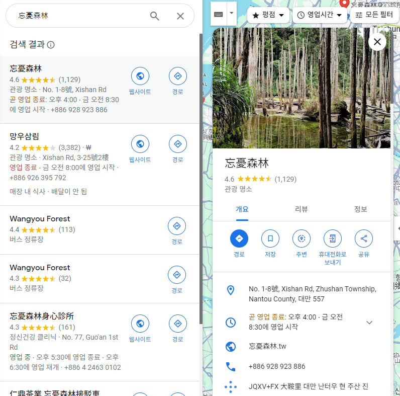 첫번째로 둘러볼 곳은 망우삼림이라는 곳입니다. 알고 계신분들도 계시겠지만 신비하고 요상한 분위기를 자아내는 늪지인데요. 여행지에서 왠 늪지냐고 하신다면 선녀가 나올법도 하고, 요정이 나올법도 한 놀라운 풍경을 눈으로 만나볼 수 있는 곳이 멀지 않은 대만에 있기 때문에 꼭 가보라고 추천드리는데요. 이 곳의 이름처럼 근심을 잊게 만드는 곳이 아닐까 싶습니다.